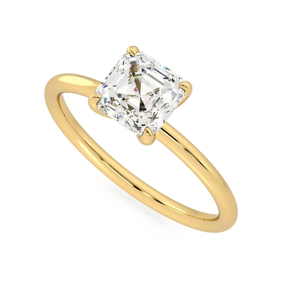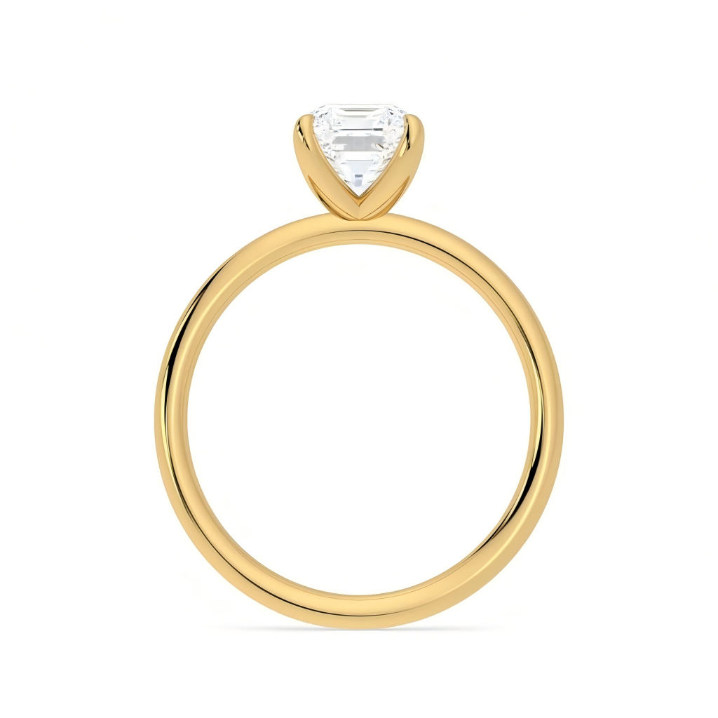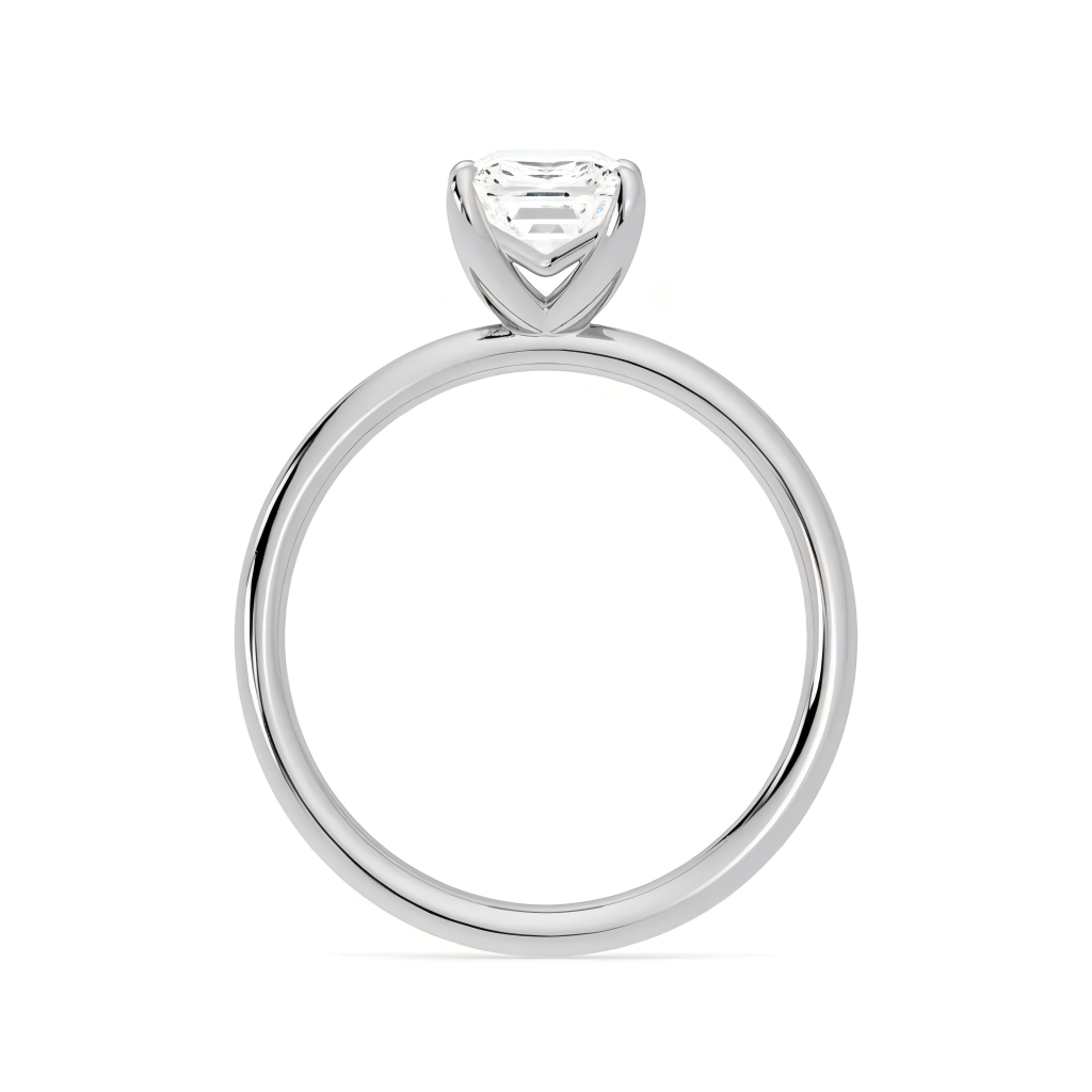 Classic engagement ring featuring a cultured diamond Asscher cut center stone in a secure four claw setting. Clean lines, strong sparkle, and a timeless silhouette. Choose 18K white gold, 18K yellow gold, or PT950 platinum, and select your ring size.
