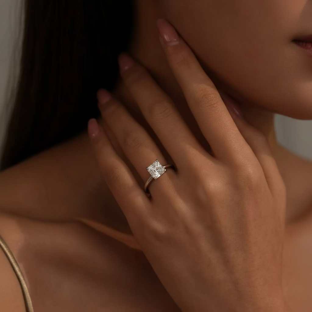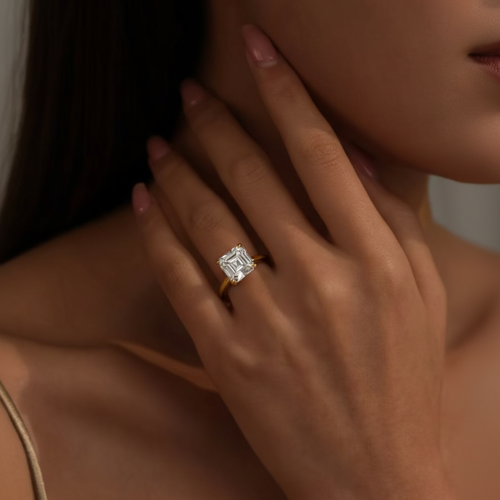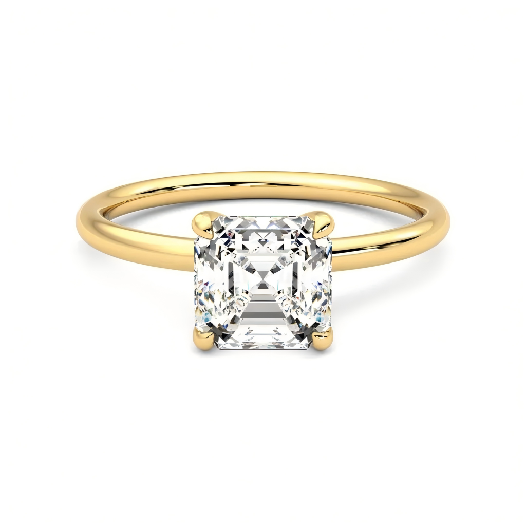Classic engagement ring featuring a cultured diamond Asscher cut center stone in a secure four claw setting. Clean lines, strong sparkle, and a timeless silhouette. Choose 18K white gold, 18K yellow gold, or PT950 platinum, and select your ring size.